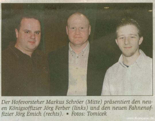 Daniel Böttcher (und nicht wie gestern irrtümlich vermeldet Werner Sörries) ist im Rahmen der Jahreshauptversammlung der vierten Kompanie der Werler Schützen zum neuen Offizier bestimmt worden. Sein Vorgäger war Heribert Kaminski, der sein Amt ebenso wie der bisherige Königsoffizier Bodo Ostermann zur Verfügung stellte. Für Ostermann ist Jörg Ferber als Königsoffizier nachgerückt (wie berichtet).