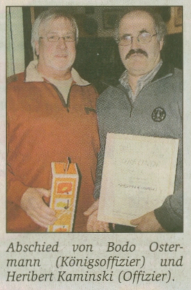 Heribert Kaminski und Bodo Ostermann erklärten bei dem Treffen ihren Rücktritt als Offizier bzw. als Königsoffizier. Beiden verdienten und langjährigen Schützenbrüdern wurde mit einem Präsent für ihre hervorragende Arbeit gedankt. Auch der Beifall der Anwesenden unterstrich die lobenden Worte des Hofevorstehers Markus Schröer. Das Amt des Offiziers, das bis jetzt Heribert Kaminski bekleidete, wird nun von Werner Sörries ausgeübt. Königsoffizier für Bodo Ostermann ist jetzt Jörg Ferber.