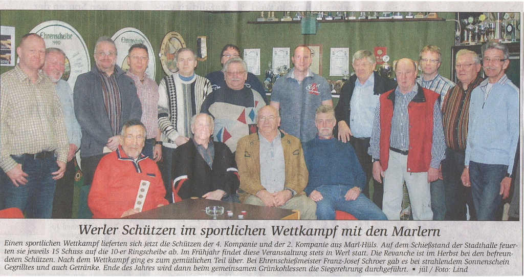 Die Mitglieder der vierten Kompanie der St.Sebastianus Schützenbruderschaft Werl fahren am 04. September zum Schützenfest nach Marl-Hüls. Hierzu sind auch alle Mitglieder der Werler Bruderschaft eingeladen. Der Bus fährt um 13.00 Uhr vom Kompanielokal Melsterhofe. Seit über 20 Jahren besuchen sich die 4. Kompanie Melsterhofe und die 2. Kompanie Marl-Hüls nun gegenseitig auf ihren Schützenfest. Das Marl-Hülser Schützenfest, welches nur alle 2 Jahre gefeiert wird, findet von Samstag, 03. September bis Montag, 05. September statt.