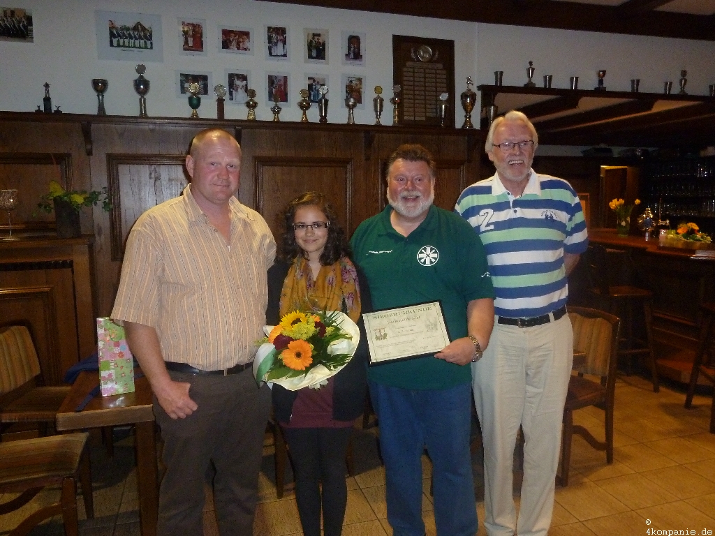 Im Biergarten der Melsterhofe fand der Mukkenabend der 4. Kompanie statt. Im Beisein der Avantgarde wurde das Mukkenkönigspaar 2011 ermittelt. Ulli Peters hatte ein Ice Curling Spiel als Tischversion aufgebaut. Hierbei setzten sich Laura Marie Emig mit 27 Punkten und Heinz Weber mit 33 Punkten durch. Im Anschluss beehrte uns noch das Königspaar Jan Schumacher und Vanessa Krismann mit ihrer Anwesenheit.